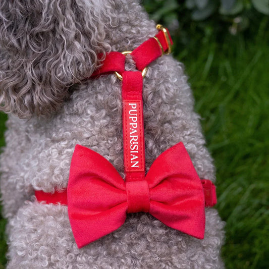 Sametový postroj typu guard pro psa s mašlí 2.0 – červený