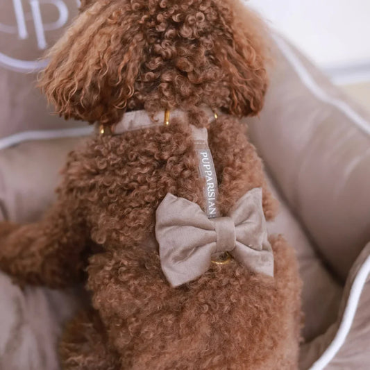 Sametový postroj typu guard pro psa s mašlí – béžový