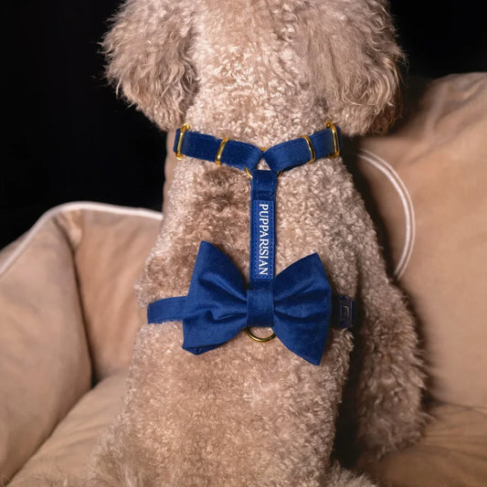Sametový postroj typu guard pro psa s mašlí – tmavě modrý